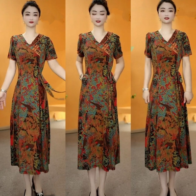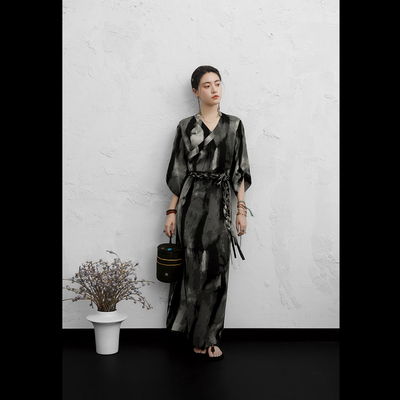 半山听雨 藏族元素连衣裙女新中式国风水墨V领收腰显瘦西藏服长裙253元淘宝258元