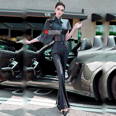 格纹网纱印花斗篷上衣喇叭裤两件套2025夏季原创设计小众短袖套装598元天猫698元