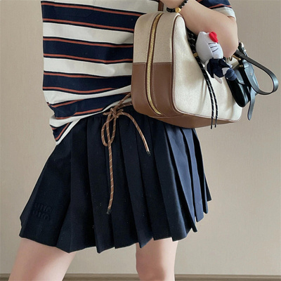 初春少女贴布字母深蓝色抽绳系带高腰百褶裙减龄百搭半身短裙现货138元淘宝148元