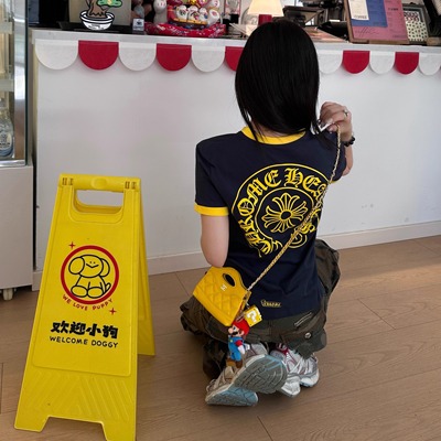 Narcos25早春新款 梵文马蹄印花蓝黄拼色校园风圆领修身短袖显瘦169元淘宝199元