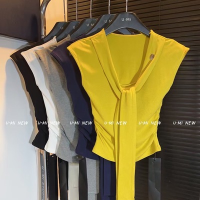 学院风披肩领带短袖t恤2025夏季V领独特设计简约修身气质短上衣女41元淘宝49元