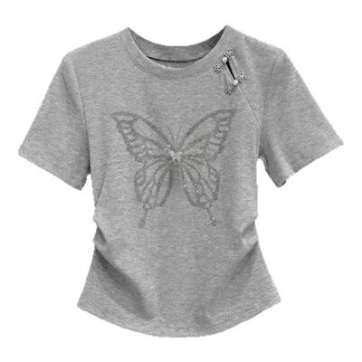 2025夏季新款时尚百搭优质纯棉短袖T恤女蝴蝶烫钻镂空捏褶上衣29.9元淘宝30.9元