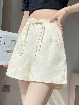 2025夏季新款盘扣高腰新中式提花冰丝缎面短裤女国风a字阔腿热裤38.9元淘宝39.9元