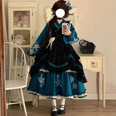 双月原创 蓝月岛 日常洛丽塔国风汉元素长袖lolita连衣裙罩裙套装368元淘宝398元