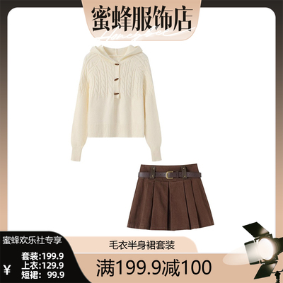 【蜜蜂欢乐社】秋冬穿搭一整套女新款牛角扣针织衫百褶短裙两件套99.9元淘宝199.9元