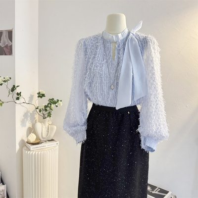 法式立领流苏飘带雪纺长袖衬衫女76元天猫79元