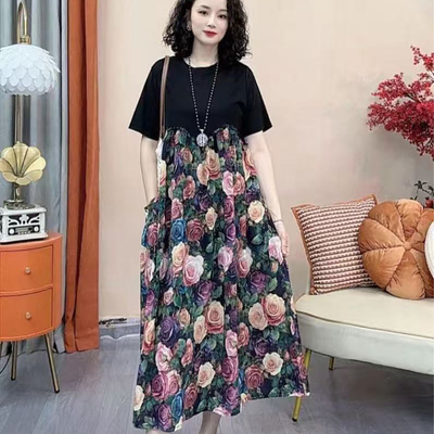 短袖拼色中年女装妈妈连衣裙浪漫78元淘宝79元