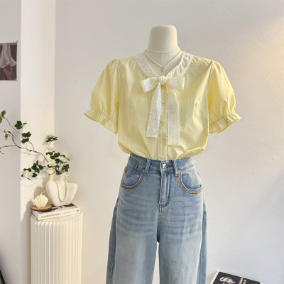 宽松法式花边飘带泡泡短袖衬衫女76元天猫79元