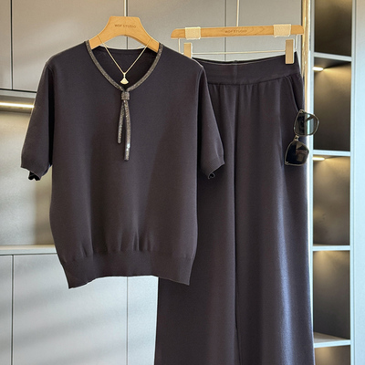 时尚洋气妈妈装冰丝套装女短袖夏装新款气质百搭中老年针织两件套256元淘宝374元