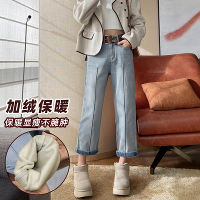 直筒裤女九分浅蓝色高腰加绒加厚145元天猫148元