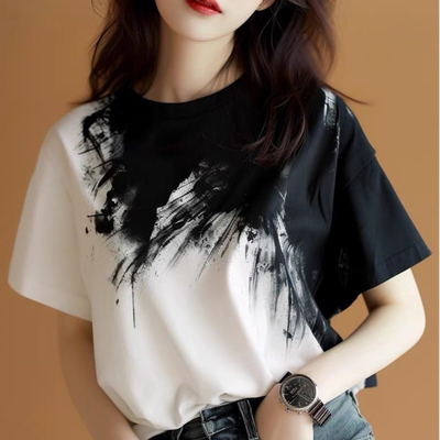 2025款水墨印花黑白晕染女短袖T恤女士夏款洋气高端上衣奢华大码19.96元淘宝24.96元