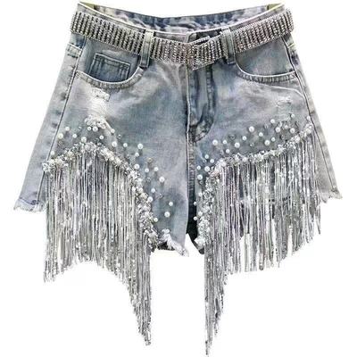 牛仔短裤女2025夏装新款欧货高腰显瘦重工钉珠亮片流苏破铜牛仔裤49.8元淘宝52.8元