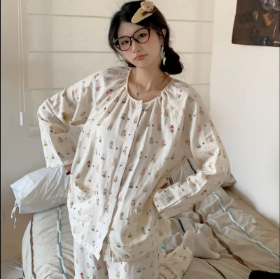 2025新款全棉印花双层纱睡衣女纯棉翻领长袖长裤纯棉春秋家居服69.9元淘宝89.9元