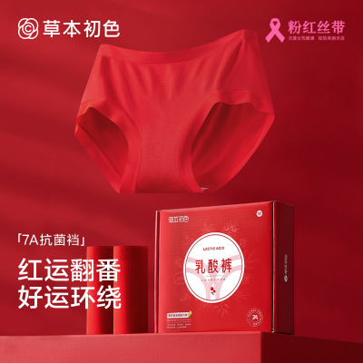草本初色本命年红内裤女士7A抗菌无痕加长档中高腰三角裤结婚礼盒60.9元天猫75.9元