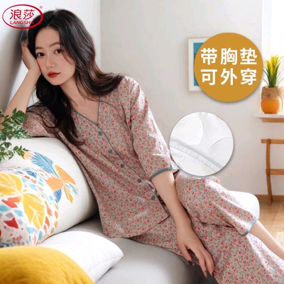 浪莎纯棉带胸垫睡衣女夏季九分裤49.9元淘宝59.9元