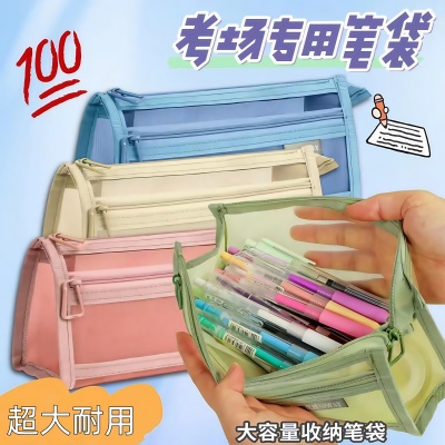 网纱莫兰迪笔袋ins简约透明双层大容量文具学生考试拉链收纳袋4元淘宝7元